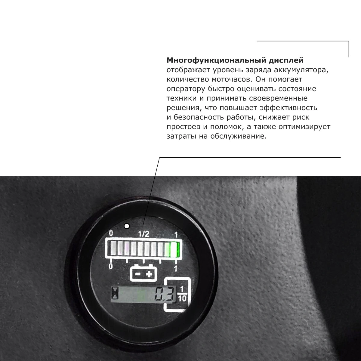 - Многофункциональный дисплей отображает уровень заряда аккумулятора, количество моточасов. Он помогает оператору быстро оценивать состояние техники и принимать своевременные решения, что повышает эффективность и безопасность работы, снижает риск простоев и поломок, а также оптимизирует затраты на обслуживание.
